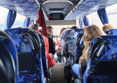 Inside the bus. Rows of seats for passengers. Long distance travel by public transport. Regular bus with people inside.