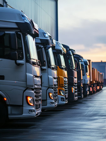 A variety of trucks are parked in a lot next to a large commercial warehouse at dusk, ready for cargo transport activities.
