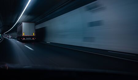 Cars on a highway going through a long modern tunnel (motion blurred image; color toned image)