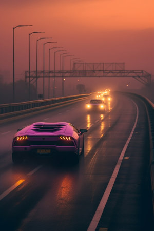 Driving cars on a wet highway at dusk under a cloudy sky in Germany, motion blur, copy space, selected focus, narrow depth of field