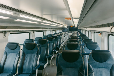A spacious interior view of a train featuring empty seats, showcasing modern design and a tranquil atmosphere perfect for a travel journey.