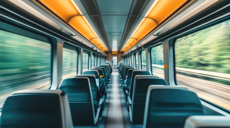 Experience the serene ambiance of an empty train cabin, featuring bright lighting and captivating views of lush greenery through the windows, perfect for showcasing modern travel.