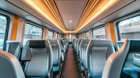 An empty train interior showcasing modern design with spacious seating and soft lighting, perfect for transportation, travel, and commuting visuals.