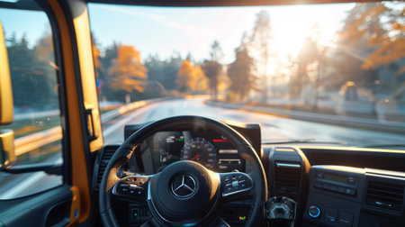 Driving view from inside a car on a sunny road with motion blur and bright sunlight filtering through