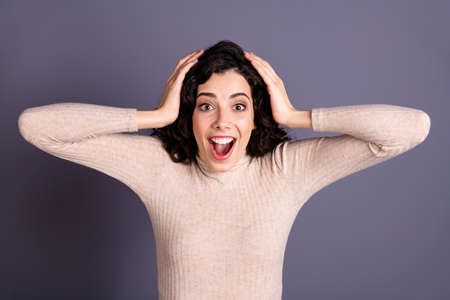 Close-up portrait of her she nice-looking attractive lovely winsome charming cute cheerful cheery overjoyed wavy-haired lady wow good news isolated over gray violet purple pastel background