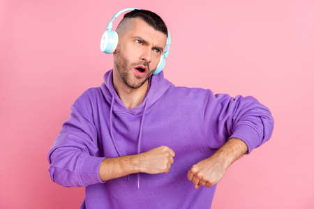 Photo of young man have fun dancer disco earphones rhythm fooling isolated over pink color background