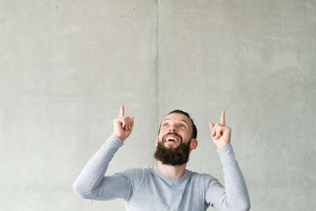 Goods promotion. Cheerful hipster guy looking up and pointing fingers in air. Gray wall background. Copy space.