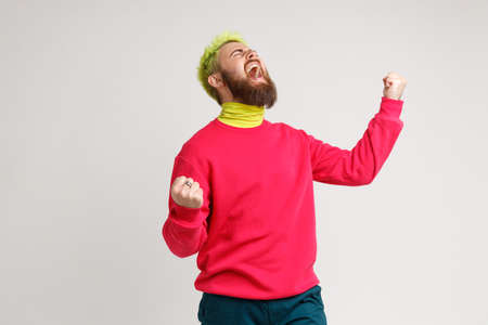 Portrait of cheerful bearded man with excited expression, raising fists, screaming, shouting yeah, wearing red jumper, celebrating his victory, success. Indoor studio shot isolated on gray background