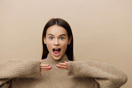 a funny, emotional woman vividly expresses her emotions by shouting with her mouth wide open and holding her fingers apart near her face