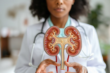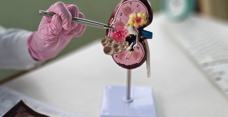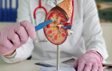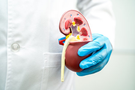 Healthcare professional holds kidney model to explain organ functions during a medical consultation in a clinic setting