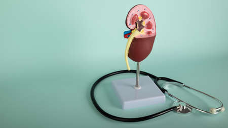 Anatomical model of human kidney and with pills in the clinic. Treatment of kidney disease and pills for kidneys and drugs for treatment