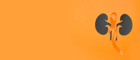 A close up of a pair of kidneys with red and orange blood vessels. The image is a representation of the human body and its internal organs