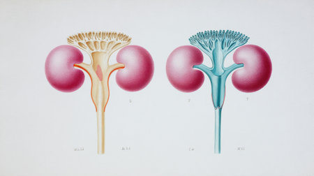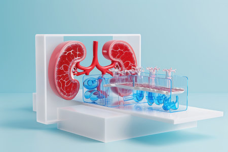 Explore a vibrant anatomical model of the human kidney, showcasing intricate details of renal structures, blood vessels, and surrounding tissues for educational purposes.
