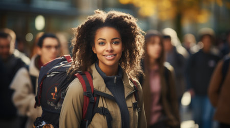 African female student refugee with a backpack at a university campus. Young woman. Concept of academic aspirations, new beginnings, immigrant education, refugee integration, diversity
