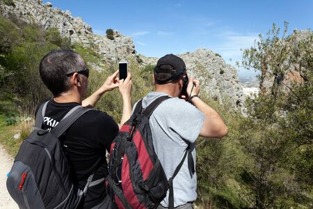 Hiker couple taking photos with the mobile phone in a natural park surrounded by mountains.