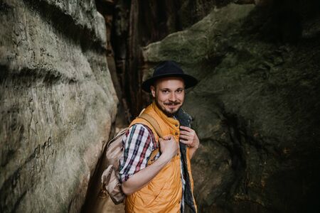 Young handsome man posing in autumn forest on road. young hipster guy with backpack , traveler standing in woods, Hiking, Forest, Journey, active healthy lifestyle, adventure, vacation concept.