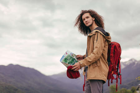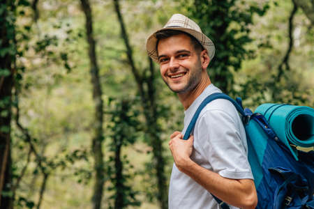 Young male hiker with backpack. Active healthy lifestyle adventure journey vacations