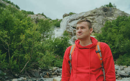 Positive young male tourist. in casual clothes and with a backpack stands on a mountain road, backdrop of a beautiful natural landscape with coniferous forest and looks in camera with a smile on face.