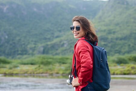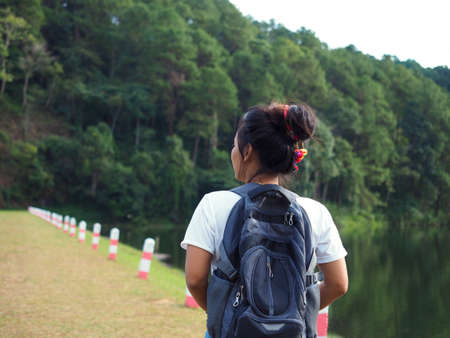 Young Asian woman traveler backpack standing alone front of forest and the lagoon in natural background
