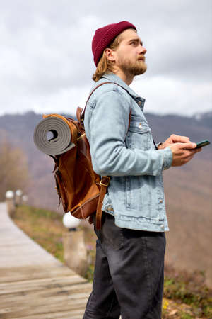 Side view portrait of handsome bearded man traveler with backpack using smartphone, mobile phone, checking online map while traveling, hiking. travel concept