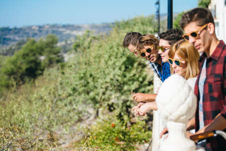 A group photo of young people having fun outdoors. A company of cheerful travelers on a blurred natural background.
