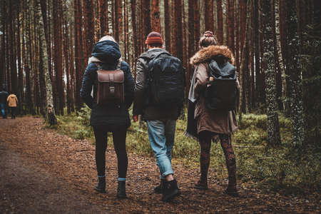 Three best friends are hiking in autumn pine forest with backpacks.