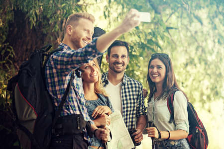 Girl taking a photo of her friends. Group of young friends hiking through forest.