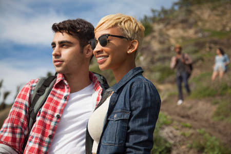 Young couple, outdoors, looking at view, friends trailing behind