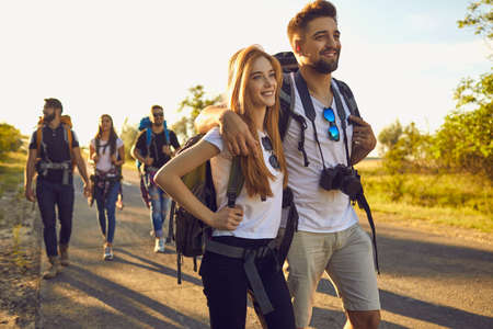 Company of cheerful hikers on road