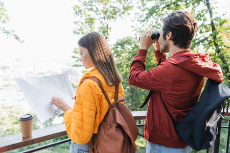 Side view of young woman looking at map near coffee to go and boyfriend with binoculars outdoors