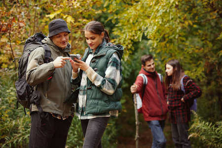Cropped portrait of two young couples on hiking on warm autumn day