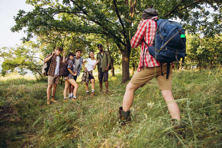Group of friends, young men and women walking, strolling together outskirts of city, in summer forest, meadow. Active lifestyle, friendship, care, ecology concept