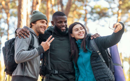 Happy multiracial friends backpackers taking selfie on smartphone over forest background