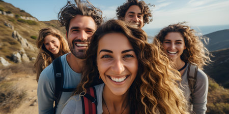Group of friends taking a selfie in the mountains. Group of hikers takes photo in nature. Camping together is fun, friendship. Students on summer vacation laughing and talking.