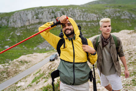 Group of hikers with backpacks, tracking in the mountains.