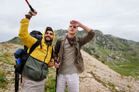 young friends hiking or trekking with a mobile phone