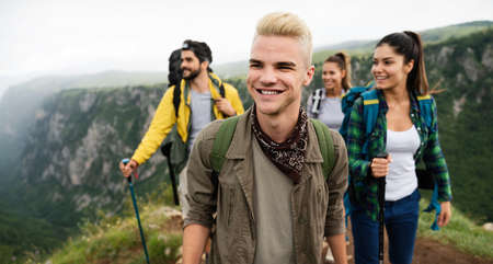 Group of happy hiker friends trekking as part of healthy lifestyle outdoors activity