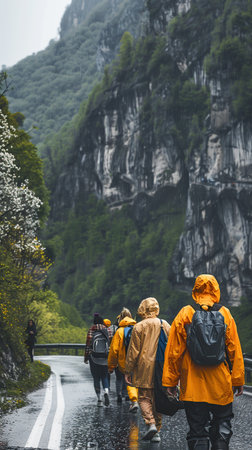 Group of tourists in raincoats walking on the road in the mountains