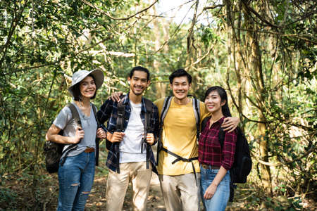 Group of young Asian man and woman friend traveling in the forest together. They are feeling fresh and relax in nature wild, looking and pointing the view then continue walking with happiness and fun.