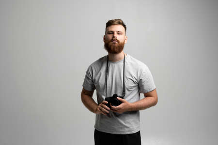 Portraite of bearded professional photographer with dslr camera isolated on gray background.