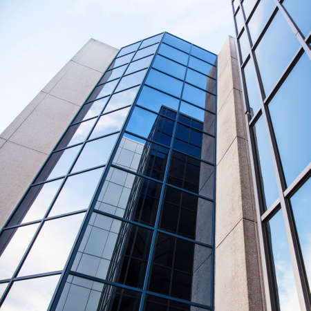 High and glassy office building, from the worm eyes view, showing an interesting reflection