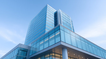 A striking modern office building features expansive glass panels and sleek lines, set against a clear blue sky, reflecting corporate sophistication and style.