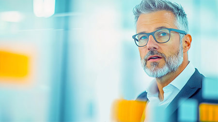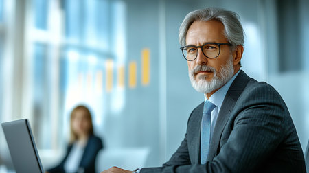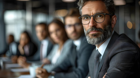 A mature businessman with glasses and a grey beard sits confidently in a modern conference room. His professional appearance and composed expression convey experience and leadership in the corporate world.