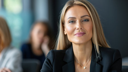 A confident businesswoman with an elegant hairstyle sits in a professional meeting setting, exuding leadership and engagement in her corporate environment.