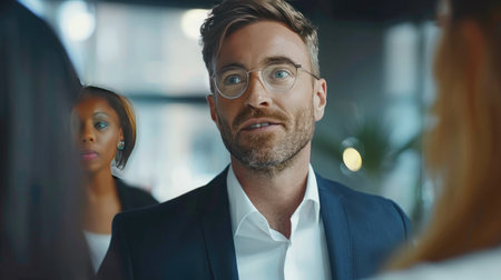 A focused businessman in glasses, with colleagues in the blurry background, concept of leadership. Generative AI