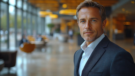Confident businessman in modern office with professional attire.