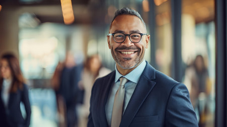 Confident businessman smiling in a modern office setting