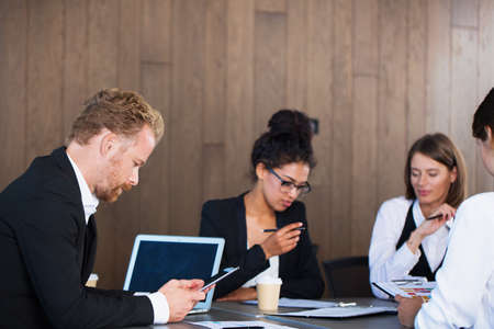 Group of young business people working and communicating while sitting at the office desk together with colleagues sitting. business meeting