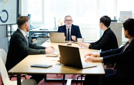 Senior manager in suit talking to partners at table with laptops during meeting at meeting room