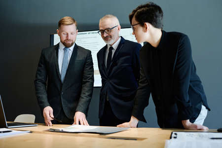 Business partners in formal suit looking at report at table and planning work in team at office
